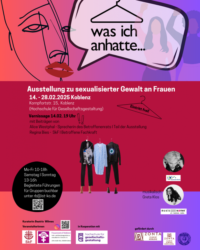 In Kooperation mit dem Sozialdienst katholischer Frauen (SkF) Koblenz [1] und dem Frauennotruf Koblenz [2] fand die Ausstellungseröffnung am 14.02.2025 im Bistro des Dreikönigenhauses statt. Gastgeber der Veranstaltung sind die Hochschule für Gesellschaftsgestaltung und das ISSO-Institut, das den Lichthof im Gebäude für die Exponate der Ausstellung zur Verfügung stellt. Dort wird die Ausstellung „was ich anhatte…“ [3] zwei Wochen bis zum 28.02.2025 zu sehen sein. Zum Abschluss ist noch eine Finissage geplant.