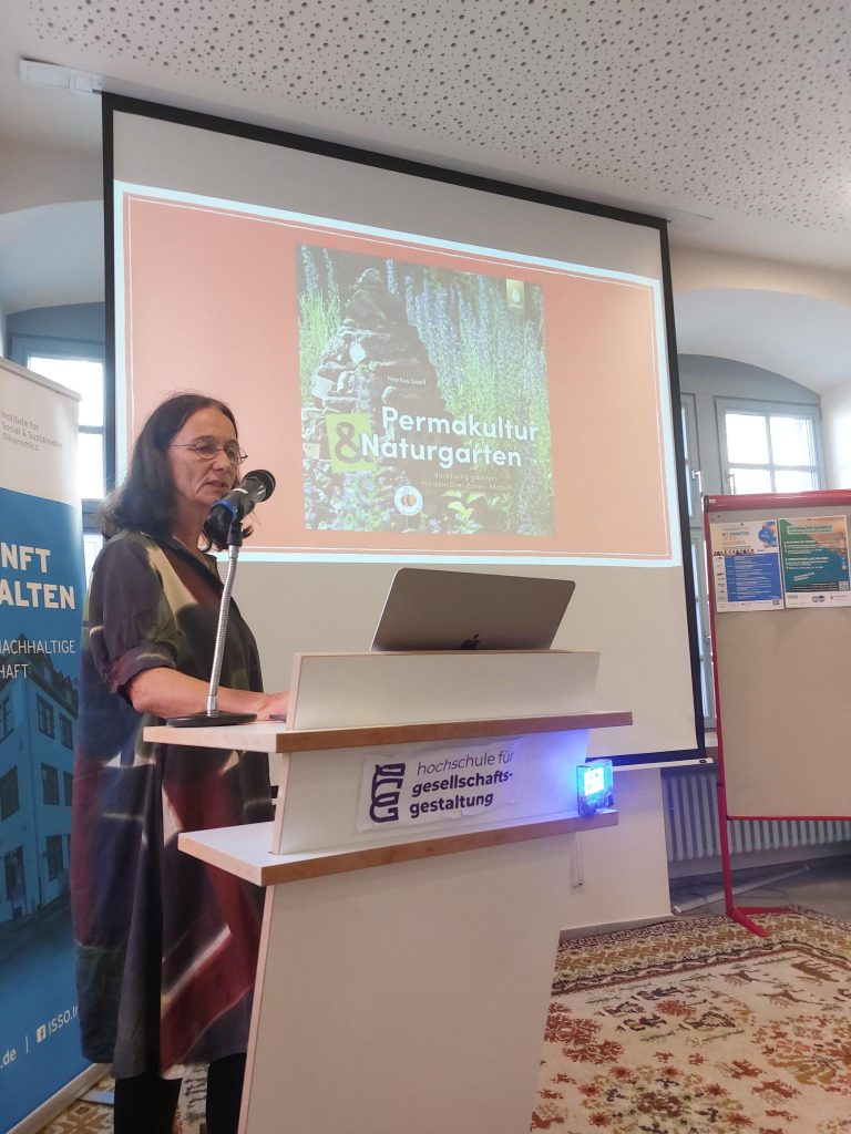 Als Landschaftsgärtnerin ergänzte Kerstin Degen die Laienbetrachtungen und regte dazu an, Gärtnern als eine Geisteshaltung zu verstehen. Den Garten als einen Naturgarten zu gestalten, passt in die heutige Zeit. Das Konzept „Permakultur“ ist nicht nur eine Alternative zur Monokultur, die den Boden schnell auslaugt, sondern bietet auch für Menschen, die berufstätig sind und nicht mehr als eine Stunde pro Tag oder noch weniger in die Gartenarbeit stecken können, einen geeigneten Ansatz. Es brauchen dabei nicht alle Flächen betreut zu werden, einige Bereiche dürfen einfach „vor sich hinwachsen“ und sich dabei als Nahrungsquelle und Biotop für Insekten und Gartentiere entwickeln. Ihr konkreter Vorschlag, das eigene Gartenkonzept in drei Zonen zu denken, bietet eine vereinfachte Betreuung und somit eine zeitlich machbare Alternative, da nur eine von den drei Zonen intensiver gedüngt und gewässert werden muss. Permakultur bedeutet ebenfalls, in Kreisläufen zu denken und alles im Garten bestmöglich (wieder) zu verwenden.