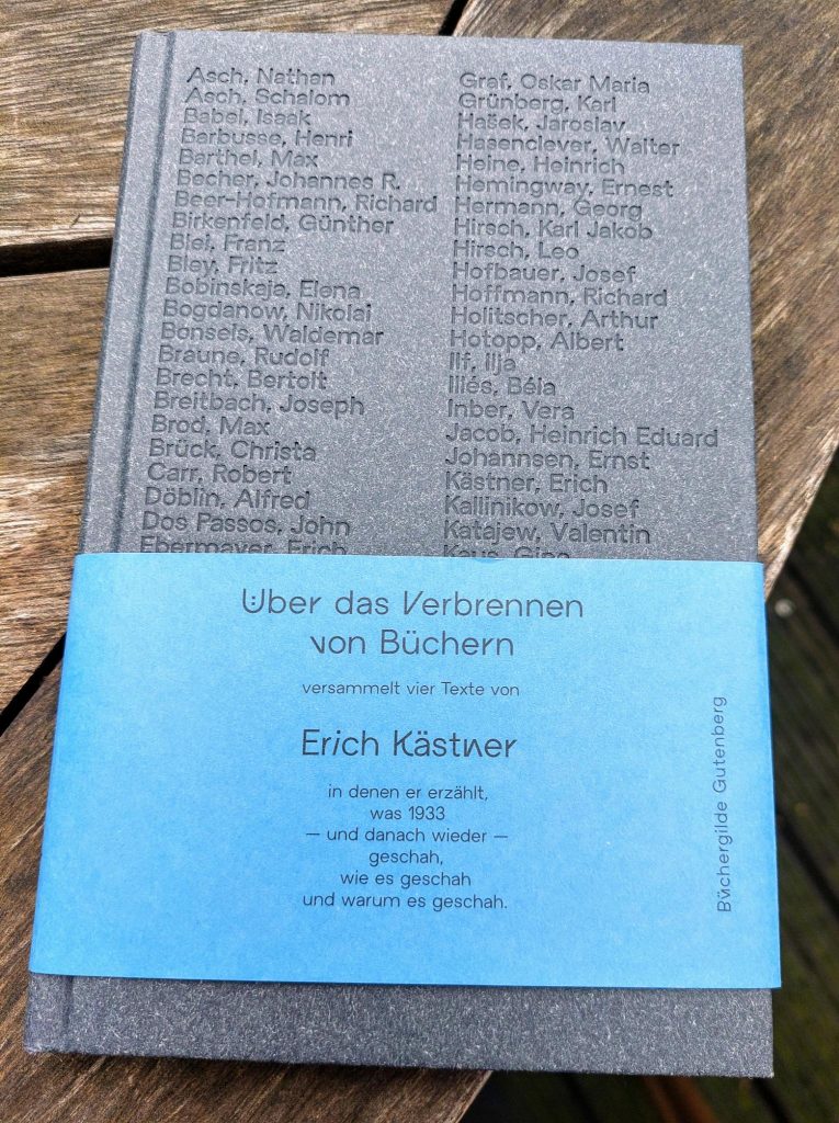 Das kleine Büchlein „Über das Verbrennen von Büchern“ der Büchergilde Gutenberg, herausgegeben 2023 als Sonderausgabe zum 90. Gedächtnistag der Bücherverbrennung, erschien als Lizenzausgabe, mit freundlicher Genehmigung der Atrium Verlag AG, Zürich. Es enthält vier Texte von Kästner. Auf seinem Buchcover sind viele Namen von Autorinnen und Autoren eingestanzt, deren Bücher damals vernichtet worden waren. Diese Liste erhebt keinen Anspruch auf Vollständigkeit, wie die Büchergilde betont, ermöglicht aber einen Überblick über die Bedrohung von Werk und Leben dieser Literaturschaffenden, von denen die meisten Deutschland im Laufe der weiteren Jahre verließen und einen Neuanfang in einem anderen Sprachraum meistern mussten. Was nicht allen leichtfiel.