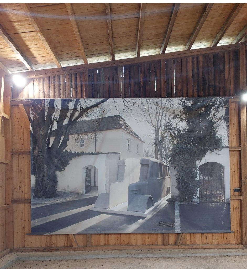 1941 wurden Patient*innen aus Zwischenanstalten mit Bussen in die Tötungsanstalt nach Hadamar verlegt. Ein hölzerner Nachbau der ehemaligen Busgarage befindet sich im Hof der Gedenkstätte. Dieser, sowie die Außenausstellung „Garten – Anstaltsfriedhof – Gedenkort. Das Außengelände des Mönchbergs“, auf dem Hügel hinter dem Gebäude, sind auch außerhalb der Öffnungszeiten zugängig.