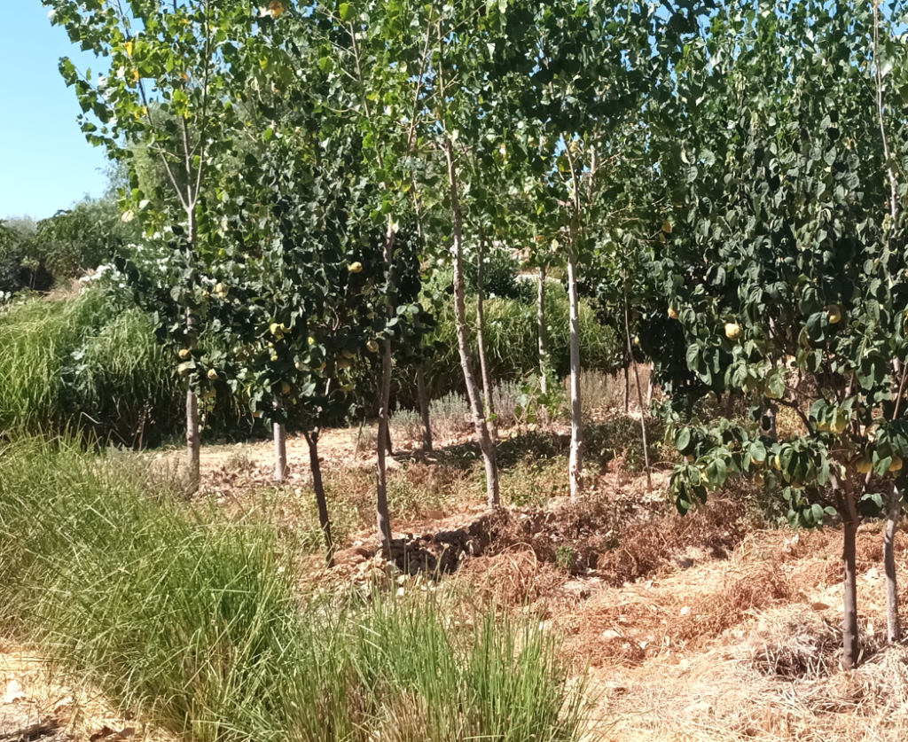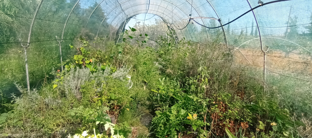 Das Thema Agroforst oder regenerative Landwirtschaft ist mittlerweile Forschungsgegenstand an vielen Hochschulen, es gehört zum „Umweltingenieurwesen“ und kommt mit Begrifflichkeiten einher wie „Welternährungssysteme“. Auf den Bildern sieht man Baumreihen und Gemüse oder Salat dazwischen, alles sehr ordentlich, gut gemulcht und gewässert, hier ein Beispiel [3]. Die Realität sieht etwas weniger ordentlich aus. Es ist Mitte September, seit mehreren Monaten gab es hier keinen Regen mehr. Alles Wasser muss mit Schlauchsystemen gezielt und sparsam verteilt werden. Große Beregnungssysteme schließen sich aus. António Coelho, der Landwirt im Projekt, begutachtet täglich die Pflanzenreihen und entscheidet, wer heute etwas Wasser bekommt. Computersysteme oder Messtechnik gibt es nicht.