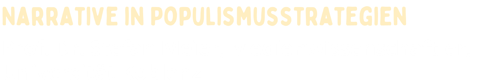 Storytelling, Narrationen und Narrative. Begriffe, die häufig im alltagssprachlichen Gebrauch sehr gleichbedeutend im Kontext politischer Kommunikation auftauchen. Gerade in der Wahlkampf- oder in der Social-Media-Kommunikation, in der sich politische Botschaften stark verdichten und auf hohe Publikumswirksamkeit ausgerichtet sind, treten diese kommunikativen Mittel verstärkt auf. Sie lassen so die fließende Grenze zum Populismus leicht überschreiten und ihre polarisierende Kraft entwickeln. Der Vortrag beabsichtigt zum einen, diese Begriffe in ihren unterschiedlichen Formen in der politischen und Social-Media-Kommunikation zu ordnen. Zum zweiten werden auch eigene Symbolpraktiken in aktuellen rechtsgerichteten Populismustrategien diskutiert.