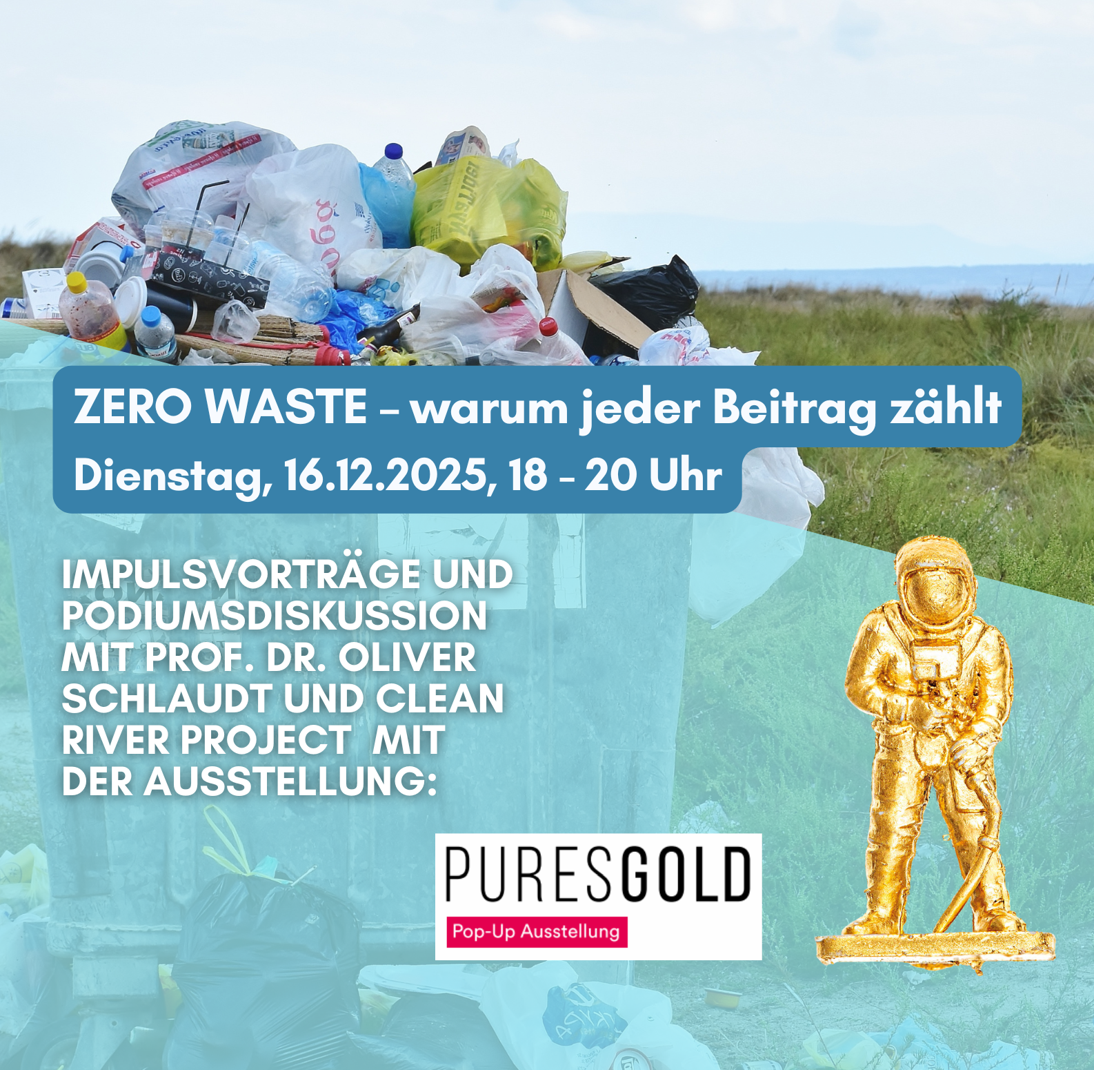 Parallel zur Veranstaltung wird die Fotokunst-Serie „PURES GOLD“ von Clean River Project gezeigt.